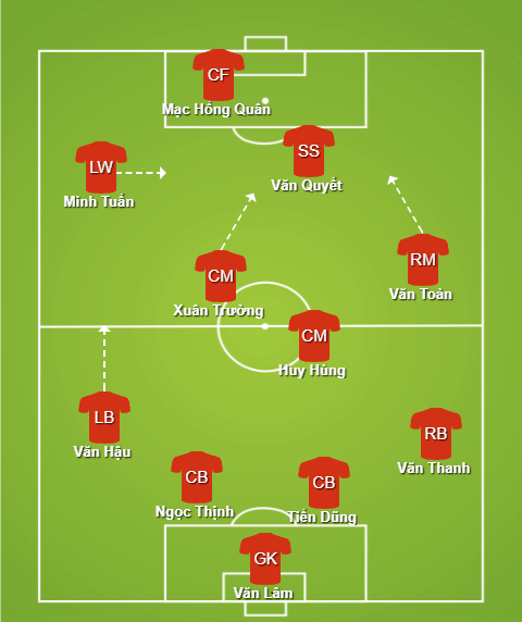Với việc Duy Mạnh và cả Hoàng Thịnh đều đang gặp vấn đề, Huy Hùng chắc chắn sẽ là người được HLV Mai Đức Chung chọn mặt gửi vàng ở vị trí tiền vệ phòng ngự. Đá cặp với Huy Hùng chính là tiền vệ của Gangwon FC Lương Xuân Trường. Hai cánh của ĐT Việt Nam sẽ là Vũ Minh Tuấn cánh trái, ở phía đối diện rất có thể Văn Toàn.
